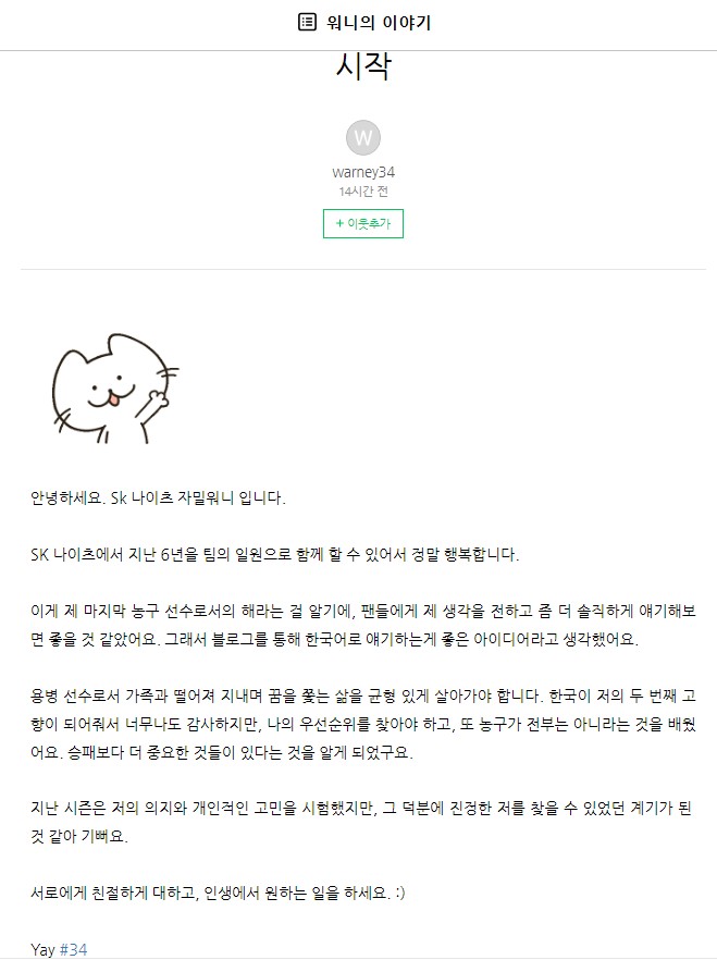 워니는 "농구 선수로서의 마지막 해라는 걸 알기에, 팬들에게 내 생각을 전하고 좀 더 솔직하게 얘기해보면 좋을 것 같았다. 그래서 블로그를 통해 한국어로 얘기하는 게 좋은 아이디어라고 생각했다"고 적었다.