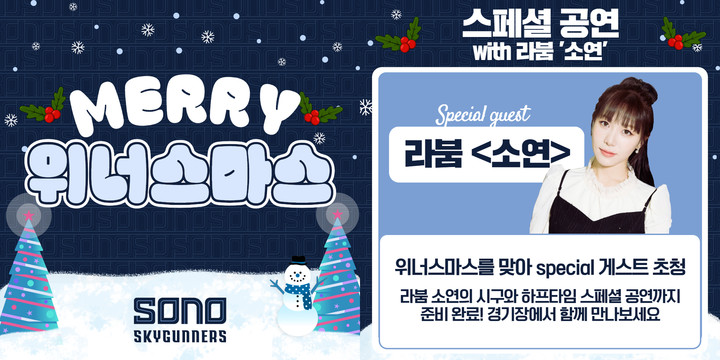 이날 경기에는 데뷔 10년 만에 첫 솔로 싱글을 발매한 그룹 라붐 멤버 소연이 승리를 기원하는 시구와 함께 겨울 시즌송 ‘White Love(스키장에서)’ 스페셜 공연으로 크리스마스 분위기를 한껏 고조시킨다.