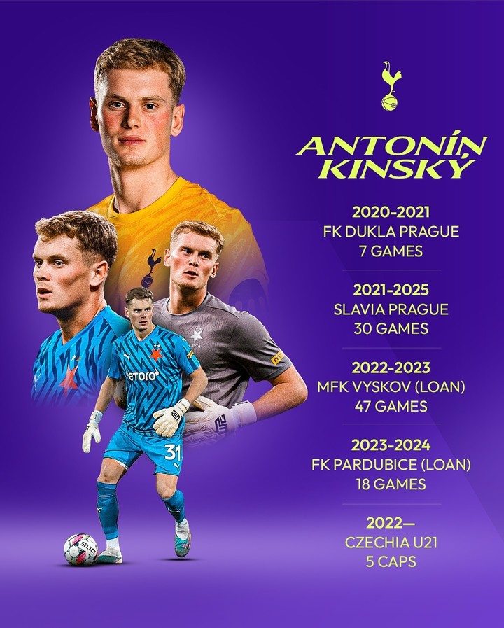 토트넘은 5일 구단 홈페이지를 통해 "우리는 SK 슬라비아 프라하(체코)의 안토닌 킨스키 영입을 발표하게 돼 매우 기쁘다"며 "21세 골키퍼는 2031년까지 계약을 체결했으며, 등번호는 31번"이라고 공식 발표했다.
