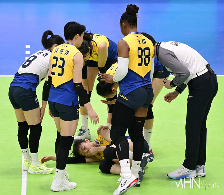 현대건설 김다인이 공에 맞아 코트에 쓰러져 있다.