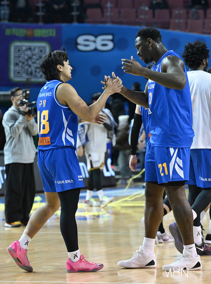 삼성 저스틴 구탕과 코피 코번이 승리에 기뻐하고 있다.