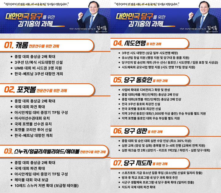 오는 23일 치러지는 대한당구연맹 회장 선거에 출마한 김기홍 후보는 21일 오전 보도자료를 통해 종목별 선수 및 17개 시도연맹, 당구 동호인, 심판, 지도자들에 대한 세부 공약을 발표했다.