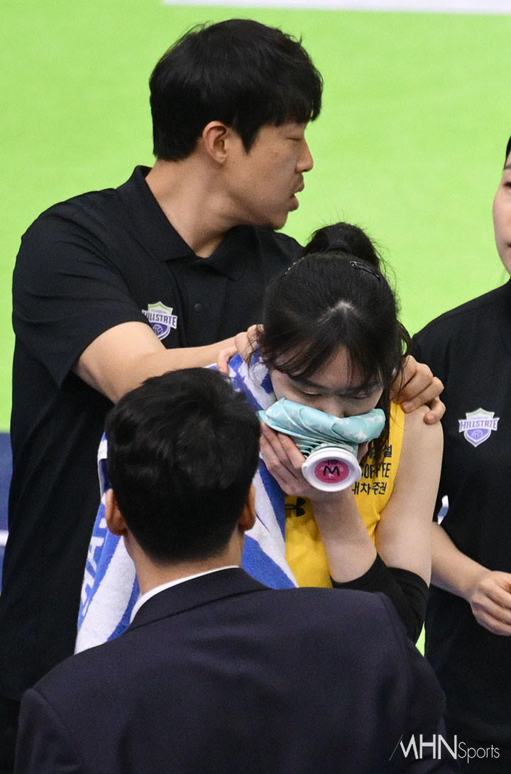 현대건설 김다인이 얼굴에 얼음을 대고 있다.