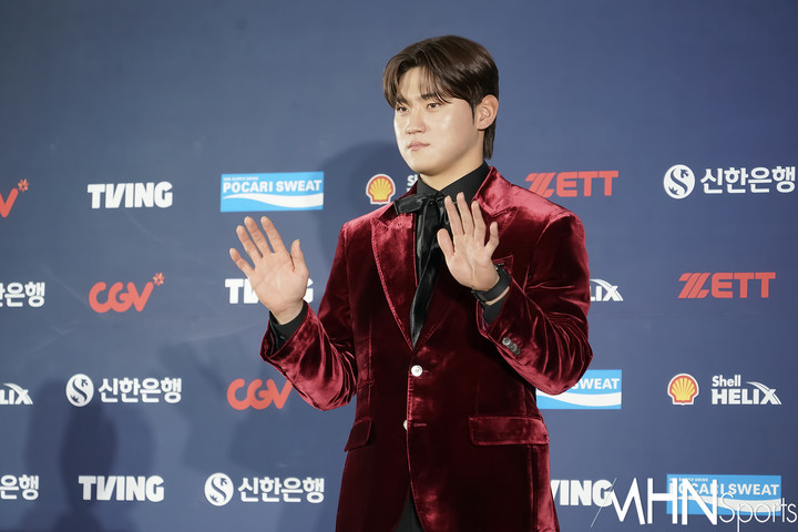 김도영이 포토월에 서서 포즈를 취하고 있다.