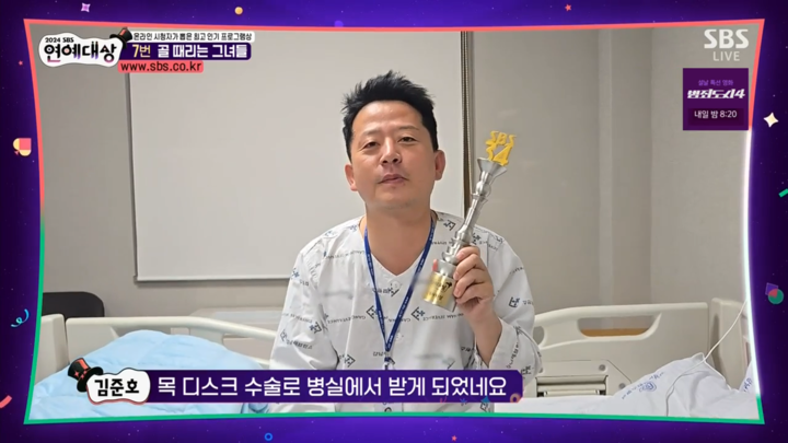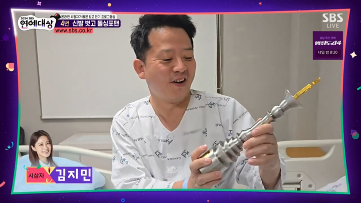 공개 열애 중인 김지민의 시상으로 병상에서 수상의 기쁨을 안은 김준호는 "목 디스크 수술 때문에 이 자리에서 받게 됐다. 명예사원상이 은근 대상보다 혜택이 낫더라. 쌀 4포대랑 SBS 식권을 받는다고 하더라"라며 "건강이 최고다. 2025년 모두가 건강했으면 좋겠다"라고 밝혔다.