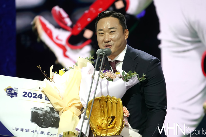 (MHN스포츠, 박태성 기자) KIA 타이거즈 김태군이 13일 서울 강남구 삼성동 코엑스 오디토리움에서 진행된 2024 신한은행 SOL 뱅크 KBO 골든글러브 시상식에서 골든포토상을 수상하며 한국스포츠사진기자협회 지형준 회장과 기념촬영을 하고 있다.