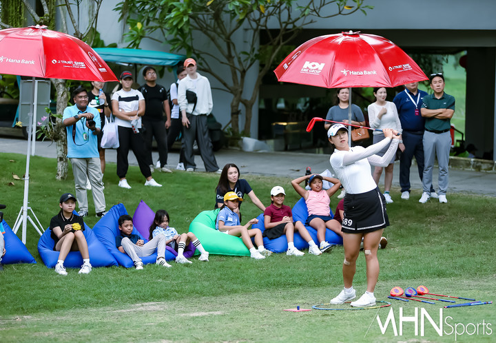 경기에 앞서 푸트리 아이샤 아마니, 유다겸, 깐 반나부디, 김하은2이 스내그 골프 파3 경기를 펼치고 있다.