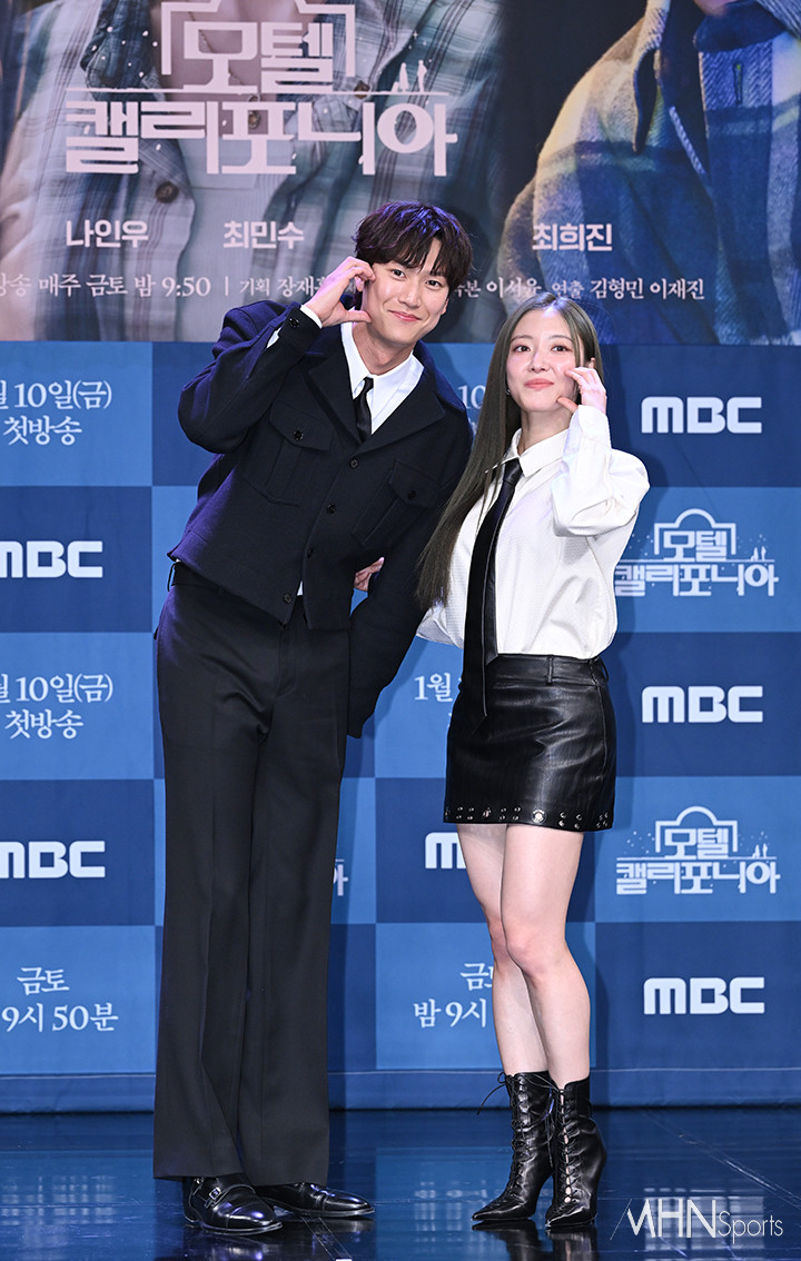 (MHN스포츠 이현지 기자) 배우 나인우, 이세영이 9일 오후 서울 마포구 상암 MBC 골든마우스홀에서 진행된 새 드라마 '모텔 캘리포니아' 제작발표회에 참석해 포토타임을 갖고 있다.