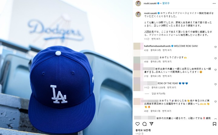 사사키는 18일 자신의 SNS 계정을 통해 "다저스와 마이너 계약을 체결했다"며 "참 어려운 결정이었지만 야구생활 이후를 돌아보면 올바른 결정이 될 수 있도록 최선을 다하겠다. 지금까지 응원해주신 모든 분께 감사드리며, 다저스 유니폼을 입고싶다고 말하고 싶다"고 전해왔다.