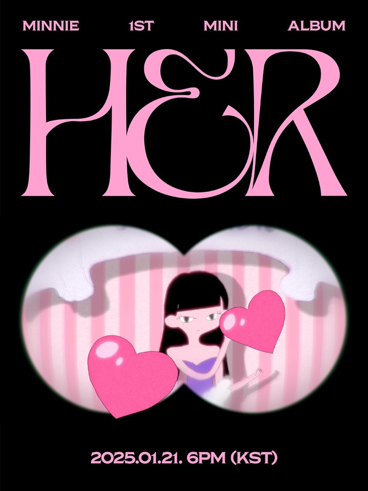 이어 공개된 아트워크 티저에서는 사랑스러운 핑크 컬러에 앨범 타이틀인 'HER'와 흑발의 민니를 형상화한 캐릭터가 커밍순 영상과 상반된 분위기를 연출했다.