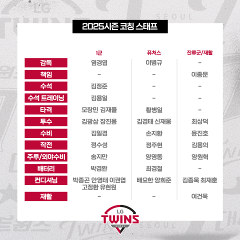 3일 LG 트윈스는 2025시즌 코칭스태프의 보직을 확정해 발표했다.