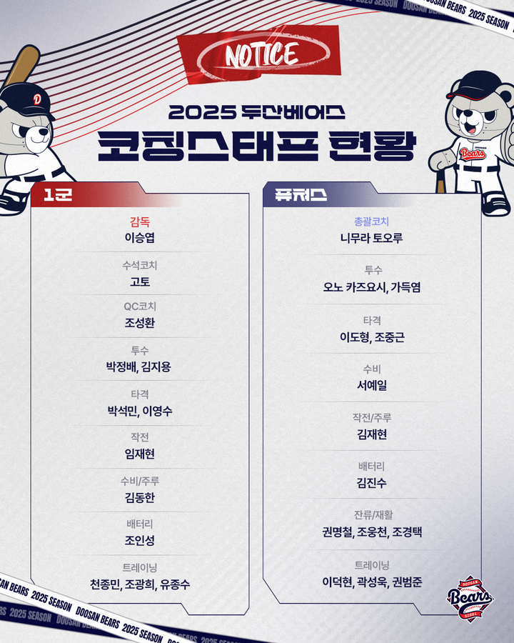 두산베어스는 14일 1, 2군 코칭스태프 명단을 공식 발표했다.