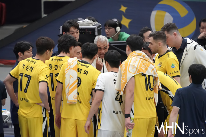 KB손해보험 레오나르도 아폰소 신입 감독이 지시를 내리고 있다.