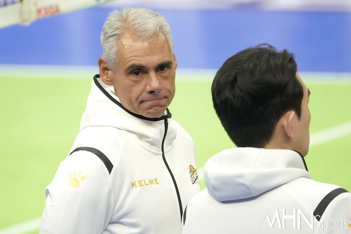 KB 레오나르도 아폰소 신입 감독이 경기 전 선수들 웜업을 지켜보고 있다.