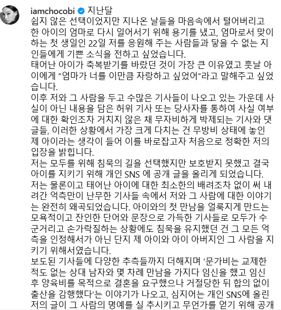 마지막으로 문가비는 “더 이상 저와 아이에 관해 무리한 억측이나 허위 사실이 유포되지 않기를 간절히 바란다”며 “모두가 이 아이를 따뜻한 시선으로 봐주기를 바란다”고 글을 마무리했다.