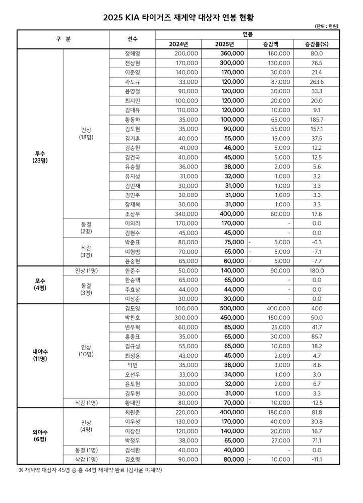 KIA 타이거즈가 2025시즌 연봉 재계약 대상자 45명 중 44명과 계약을 완료했다.