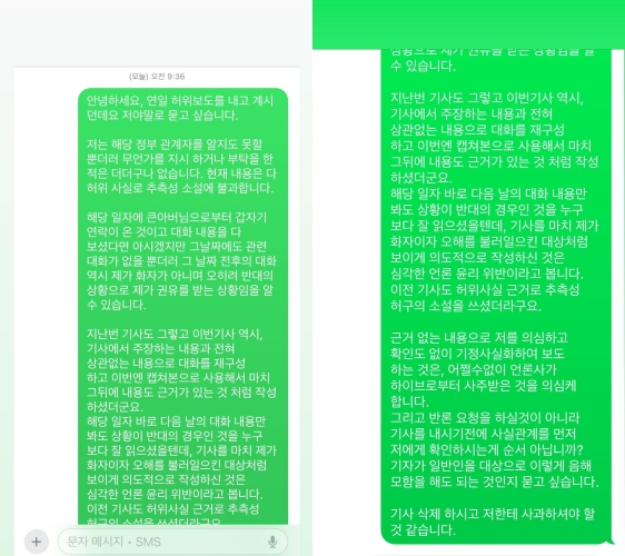 해당 보도 후 같은날 민희진은 SNS를 통해 기자와 나눈 메시지 내용을 공개했다.