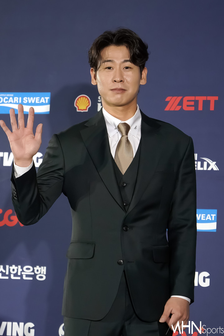 박찬호가 포토월에 서서 포즈를 취하고 있다.
