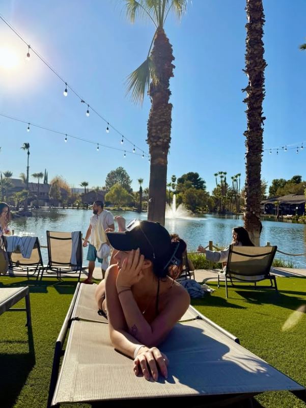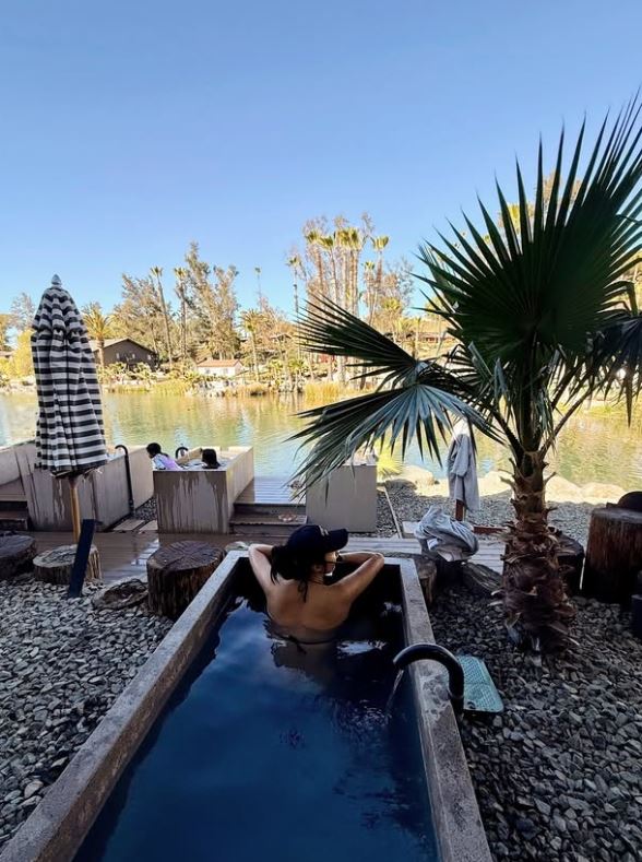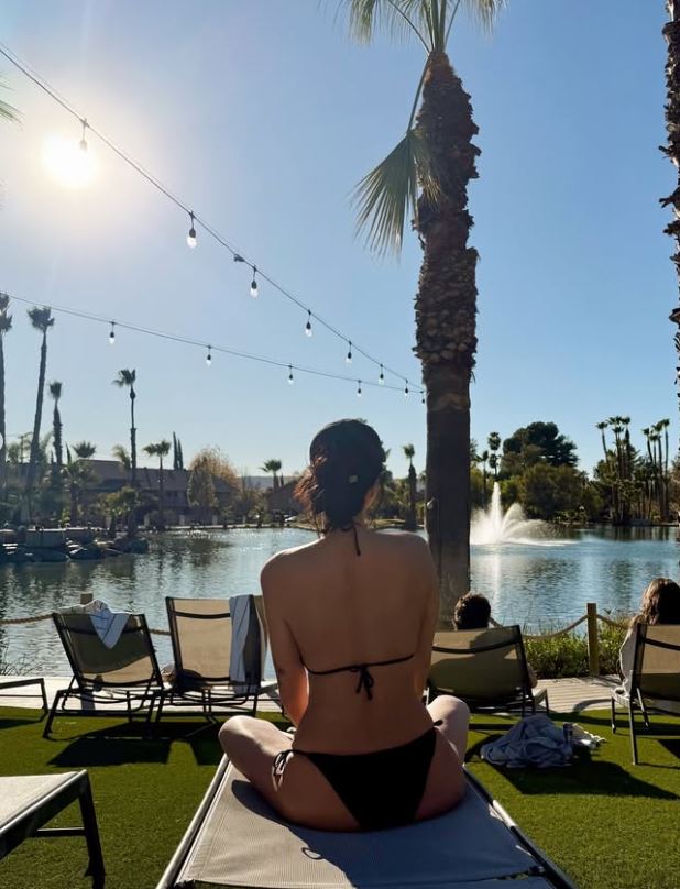 검은색 비키니를 입은 그는 선베드에 앉아 늘씬한 뒤태를 뽐내는가 하면, 야간 조명을 받으며 우아한 분위기를 자아내기도 했다.