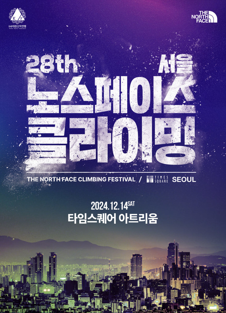사단법인 대한산악연맹(회장 손중호)은 "오는 14~15일에 걸쳐 영등포 타임스퀘어 아트리움에서 각각 '제28회 노스페이스 클라이밍 페스티벌'과 '2024 청소년 스포츠한마당 스포츠클라이밍대회'를 개최한다"고 12일 전했다.