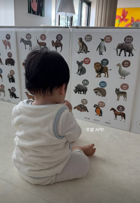 손연재는 지난 17일 소셜미디어를 통해 동물 포스터를 바라보고 있는 아들의 뒷모습이 담긴 사진을 담았다.