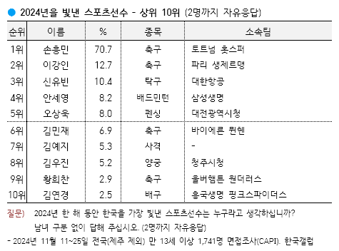자료 출처: 한국갤럽 2024년 올해를 빛낸 스포츠선수" 조사 결과