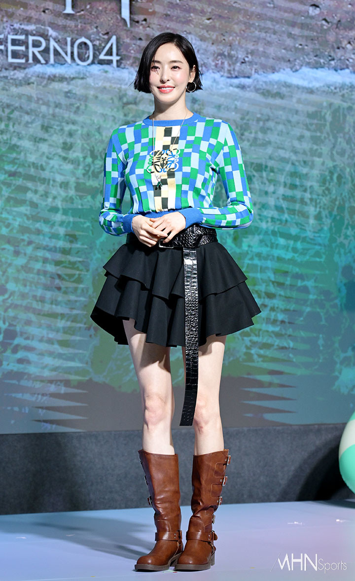 이날 이다희는 블루와 그린컬러의 체크무늬가 돋보이는 니트와 블랙 미니스커트를 모델 몸매로 완벽하게 소화해내며 시선을 사로잡았다. 긴 가죽벨트와 웨스턴 부츠도 패션 포인트.