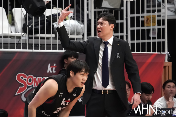 수원 KT 감독 송영진이 지시를 내리고 있다.