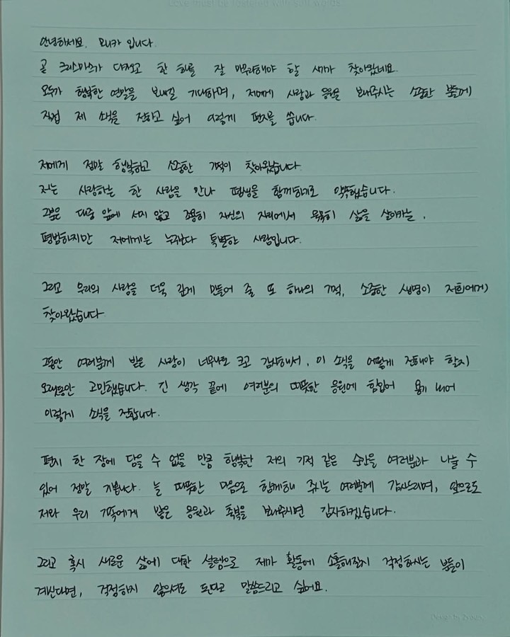 그는 "안녕하세요. 곧 크리스마스가 다가오고 한 해를 잘 마무리해야 할 시기가 찾아왔네요. 모두가 행복한 연말을 보내길 기대하며, 저에게 사랑과 응원을 보내주시는 소중한 분들께 직접 제 소식을 전하고 싶어 이렇게 편지를 쓰게 되었습니다."라며 말문을 열었다.