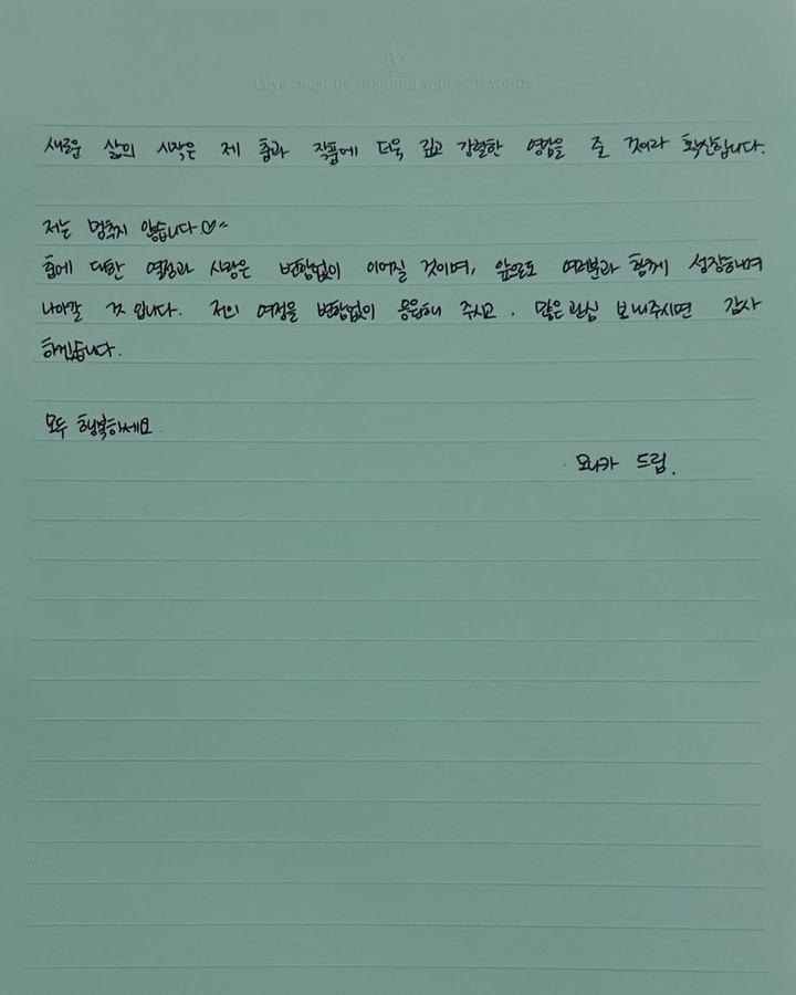 "저는 멈추지 않습니다. 춤에 대한 열정과 사랑은 변함없이 이어질 것이며, 앞으로도 여러분과 함께 성장하며 나아갈 것입니다. 저의 여정을 변함없이 응원해 주시고, 많은 관심 보내주시면 감사하겠습니다."라고 덧붙이며 춤에 대한 열정을 보이기도 했다.