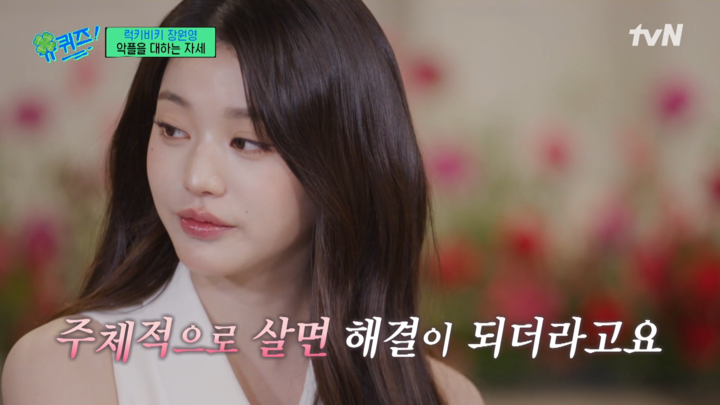 아이브 활동 4년차인 만큼 고민이 있냐는 물음에 장원영은 "저는 행복이 가장 중요한데, 이 일을 하다 보면 타의에 의해 하게 되는 일이나 듣는 말이 생긴다. 그럴 때마다 오는 스트레스가 가장 큰 고민인 것 같다. 그래서 제가 찾은 해결책은 이 인생의 주인이 나라고 생각하면서 주체적으로 사는 거다. 그러니까 크게 신경이 안 쓰이고 고민이 해결되더라"라고 밝혔다.
