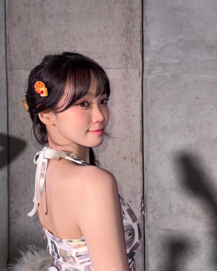 헤어스타일도 눈길을 끌었다. 길게 땋은 머리가 끝부분에서 하트 모양을 이루며 포인트를 줬고, 케이크 모양의 머리핀은 맑고 사랑스러운 이미지를 배가시키며 전체적인 룩의 완성도를 높였다.