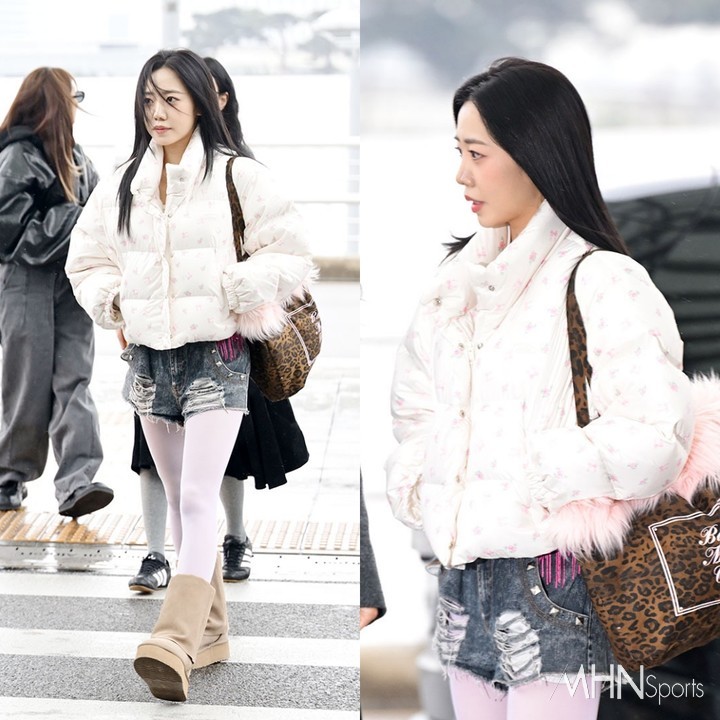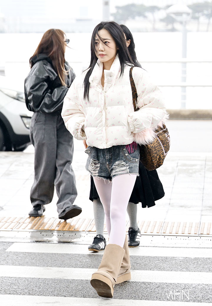 이날 에이핑크 김남주는 핑크컬러를 포인트로한 개성 넘치는 공항패션을 선보였다.