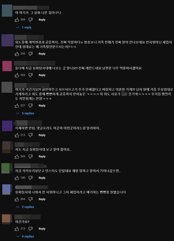 아울러 "지금 (해당 고깃집이) 카카오 리뷰도 닫고, 인스타도 닫았다", "해당 가게 아직도 영업하고 있다. 진짜 철면피들이다"라는 등 가게의 소식을 공유하는 터로 사용되기도 했다. 제보자를 향해 "남편분 힘내세요"라는 응원의 글도 이어졌다.