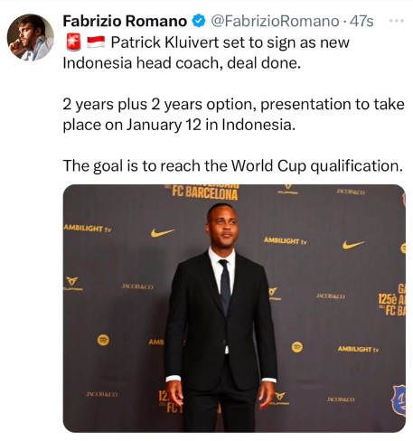 유럽축구 이적시장 전문가 중 한 명인 파브리지오 로마노는 6일 자신의 SNS를 통해 "파트릭 클라위베르트 감독이 인도네시아 축구대표팀 새 사령탑으로 계약을 맺었다. 2년 계약에 2년 연장 옵션을 포함했다"고 전했다.