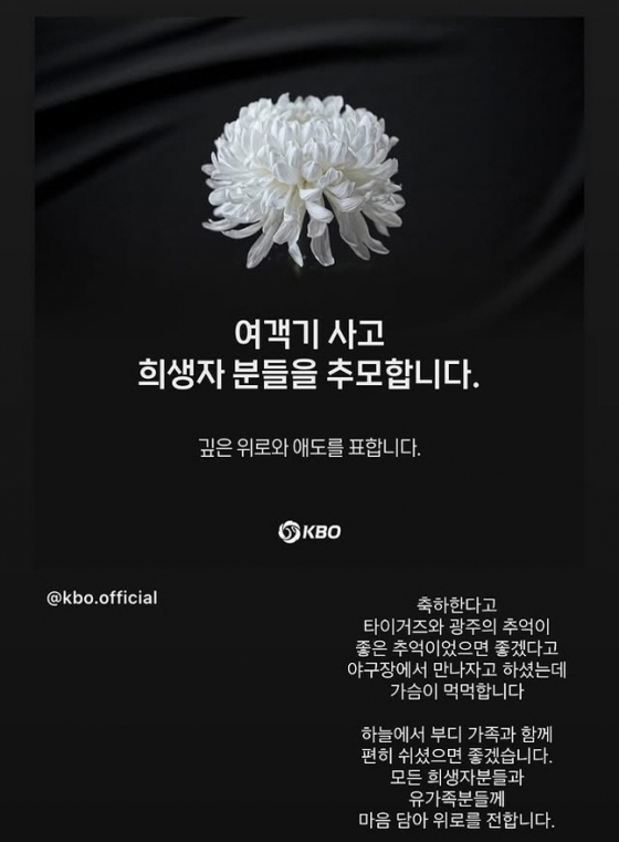 KBO는 30일 공식 인스타그램에 “여객기 사고 희생자 분들을 깊이 추모하며, 고귀한 생명을 잃은 비통함에 깊은 애도의 뜻을 표합니다. 유가족 여러분께 진심 어린 위로와 애도의 말씀을 전합니다”라는 메시지와 함께 국화 사진을 게시했다. 이어 KBO뿐만 아니라 모든 구단의 공식 계정들도 이번 사고에 대한 추모글을 게재하며 희생자와 유가족들을 위로했다.