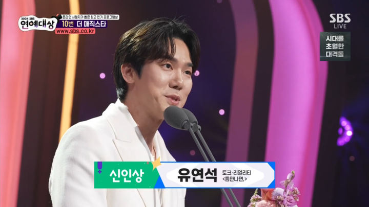 신인상은 '2024 SBS 연예대상'에 처음 참석한 유연석이 차지했다. 특히 시상은 '틈만 나면,'으로 함께한 유재석이 직접 나서 의미를 더했다.