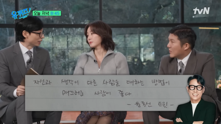 명언이나 좋은 글귀를 적어 놓았다는 김성령의 비밀 노트 중 한 구절을 입 밖으로 꺼낸 유재석은 "자신과 생각이 다른 사람을 대하는 방법이 매끄러운 사람이 좋다"고 말하며 "윤종신 트윗"이라고 덧붙여 웃음을 안겼다.