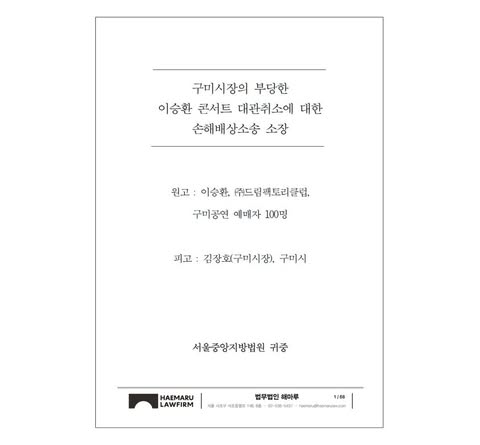 공개된 글에 따르면 원고는 이승환을 비롯해 드림팩토리클럽, 구미공연 예매자 100명이고, 피고는 김장호 구미시장과 구미시로 나타나 있다.
