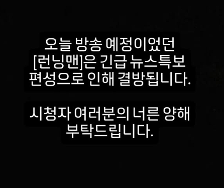 29일 SBS 일요 예능 '런닝맨'은 공식 SNS 등을 통해 "오늘 방송 예정이었던 런닝맨은 긴급 뉴스 특보 편성으로 인해 결방된다. 시청자 여러분의 너른 양해 부탁드린다"고 전했다.