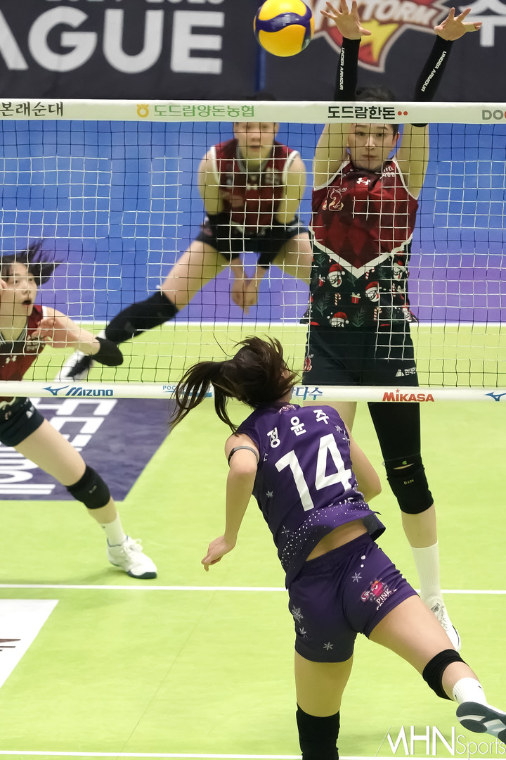 정윤주가 강한 공격을 시도하고 있다.