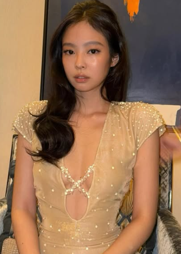 제니는 가슴 라인이 깊이 파인 누드톤 드레스를 입고 우아한 분위기를 뽐냈다. 인어공주 같은 늘씬한 자태가 돋보인다.