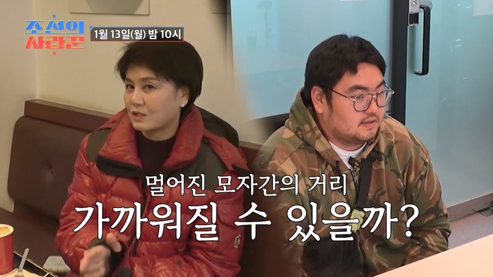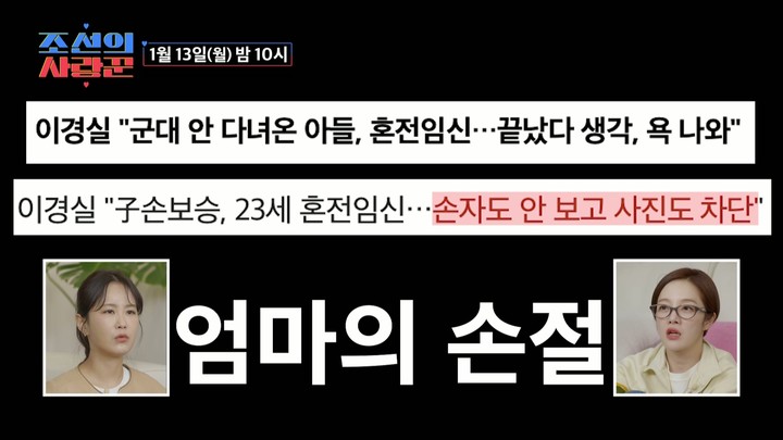 한편, 서로 다른 입장으로 회복의 기미가 보이지 않는 이경실, 손보승 모자의 관계 회복의 그 첫걸음은 오는 13일 오후 10시 방송되는 TV조선 극사실주의 다큐 예능 ‘조선의 사랑꾼’에서 만나볼 수 있다.