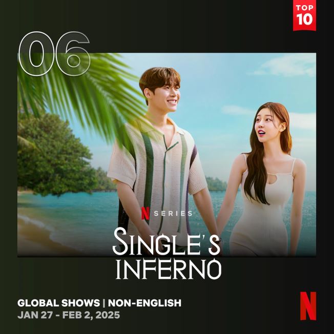 그 외 한국 작품으로는 넷플릭스 리얼리티 예능 '솔로지옥' 시즌4가 6위에 이름을 올렸다. 커플이 되어야만 나갈 수 있는 외딴 섬, ‘지옥도’에서 펼쳐질 솔로들의 솔직하고 화끈한 데이팅 리얼리티쇼다.