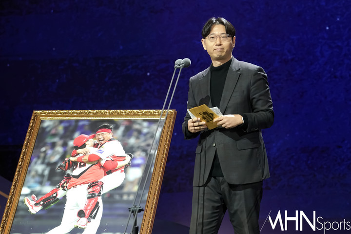 (MHN스포츠, 박태성 기자) KIA 타이거즈 김태군이 13일 서울 강남구 삼성동 코엑스 오디토리움에서 진행된 2024 신한은행 SOL 뱅크 KBO 골든글러브 시상식에서 골든포토상을 수상하며 한국스포츠사진기자협회 지형준 회장과 기념촬영을 하고 있다.