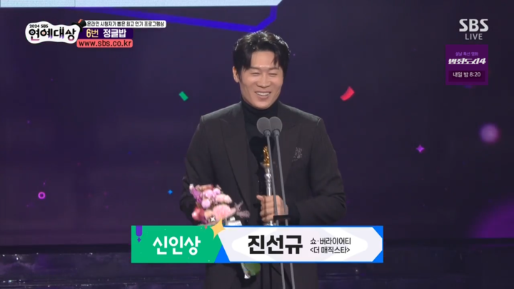 진선규는 "저한테 신인상은 아주 먼, 이제 받을 수 없는 상이라고 생각했는데, 너무 행복하다. 지난 한 해 더 매직스타와 함께 하면서 제가 뭘 했다기보다는 피 땀 흘려 만들어주신 매지션들의 무대를 보고 너무 즐겁고 행복했다. 무대를 보며 아이처럼 몇 달을 보낸 것 같은데 그런 모습을 보고 시청자분들께서도 매직스타를 사랑해주신 것 같다"며 "기도와 웃음과 희망이 많이 필요한 시기라고 생각한다. 앞으로 예능 선배들과 더불어 조언과 가르침을 받아 올해에는 대한민국 국민 모두가 예능 작품을 통해 웃고 울고 희망을 얻는 마법 같은 한 해가 되길 기원하겠다"고 말했다.