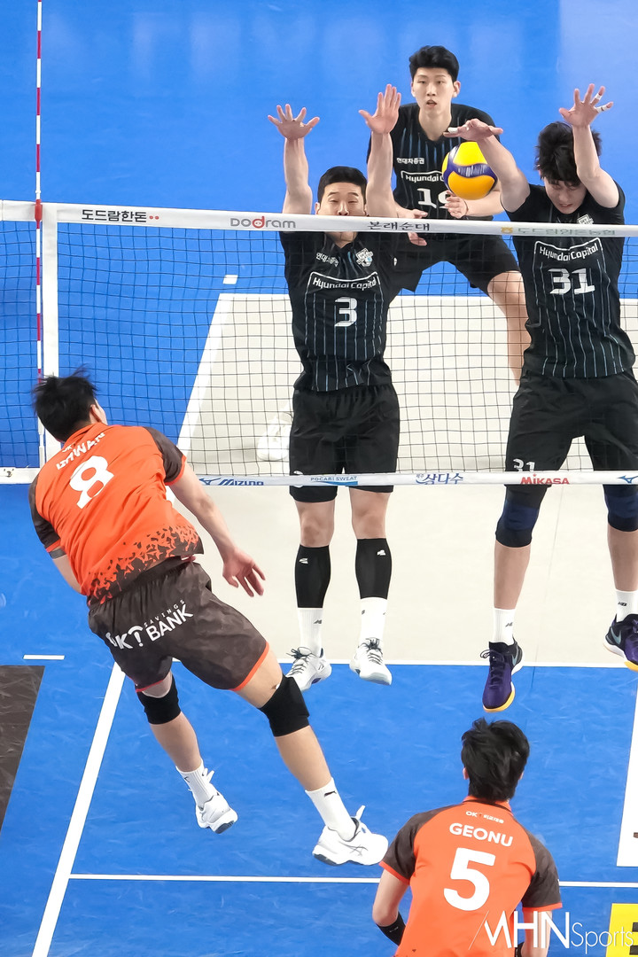(MHN스포츠 천안, 박태성 기자) 7일 오후 충남 천안에 위치한 유관순체육관에서 '도드람 2024-2025 프로배구’ 남자부 현대캐피탈 스카이워커스와 OK저축은행 읏맨 경기가 열렸다.