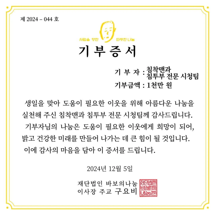 11일 침착맨은 생일과 연말을 기념하며 유튜브 채널 '침투부'의 구독자 애칭인 전문시청팀 이름으로 재단법인 바보의나눔에 1000만 원을 기부했다.