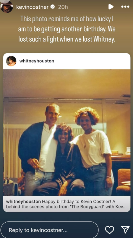 코스트너는 인스타그램에 휴스턴과 영화 촬영장에서 찍은 사진을 공유하며 (‘We Lost Such a Light’) “우리는 휘트니를 잃으면서 정말 큰 빛을 잃었다”고 적었다. 이 사진은 휴스턴의 유산 관리 단체가 운영 중인 그녀의 공식 계정에서 가져온 것으로 알려졌다.
