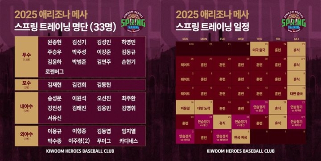 키움 히어로즈는 20일 "오는 23일부터 3월5일까지 총 42일간 미국 애리조나와 대만 가오슝에서 2025시즌 스프링캠프에 실시한다"고 전했다.